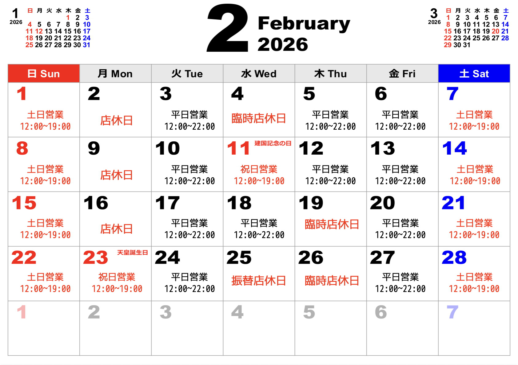 2026年2月の営業カレンダーです。