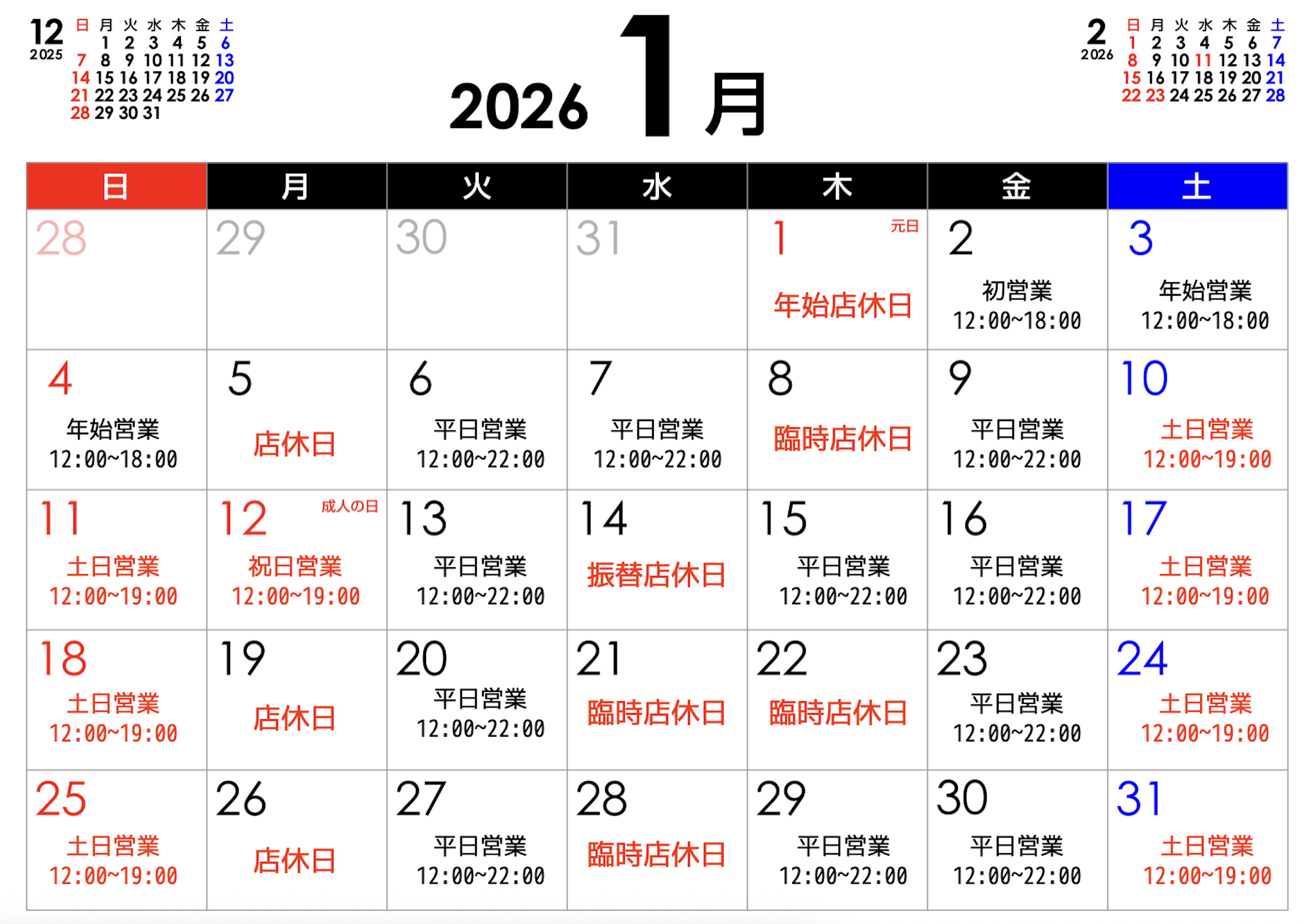 2026年1月の営業カレンダーです。
