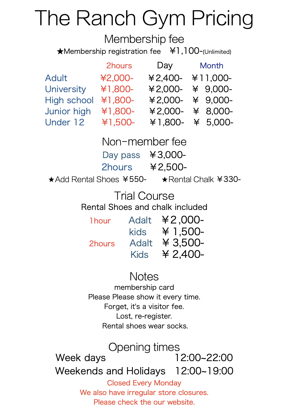 ★シューズレンタル ¥550- ★チョークレンタル ¥330-
